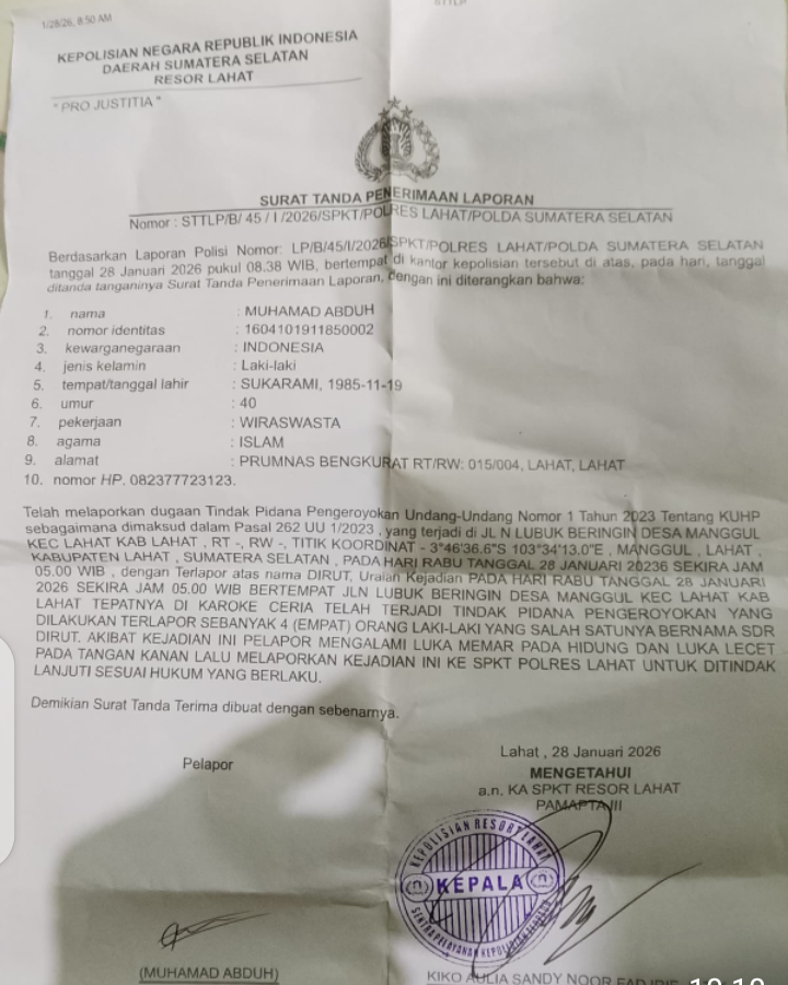 Kepada awak media, Abdu menjelaskan laporan resmi ke Polres Lahat tersebut bernomor: STTLP/B/45/I/2026/SPKT/POLRES LAHAT/POLDA SUMATERA SELATAN.